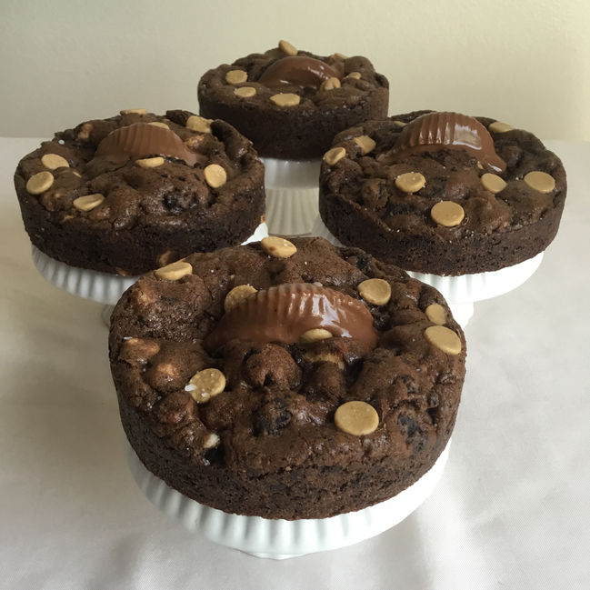 Thick chocolate cookies with peanut butter chips and Oreo cookie pieces, stuffed with peanut butter cups, topped with peanut butter cups and sprinkled with coarse salt.