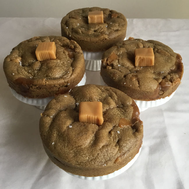 Caramel cookies with caramel pieces, filled with salted caramel, sprinkled with coarse salt and topped with caramel candies.